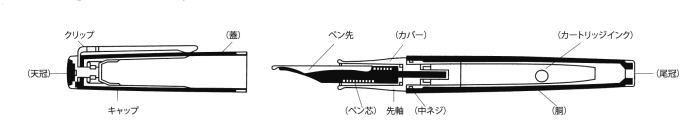 一般に使われている万年筆は、ペン・ペン芯・首・軸・鞘・カートリッジインクの6つの部品で構成されています。